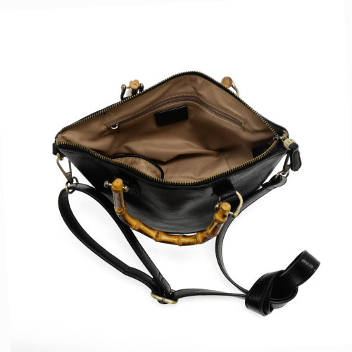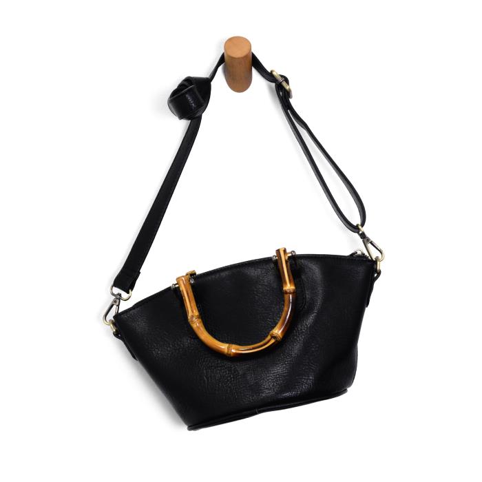 Fashioned in lustrous vegan leather, featuring genuine bamboo handles, a truly sustainable choice, this stylish and compact fan shaped tote is dainty yet surprisingly roomy. Carry by the bamboo top handles for a demure look or add the adjustable shoulder strap to carry as a crossbody. Your belongings are safely secured with a top zip closure accented with a Joy Susan Logo zip pull.