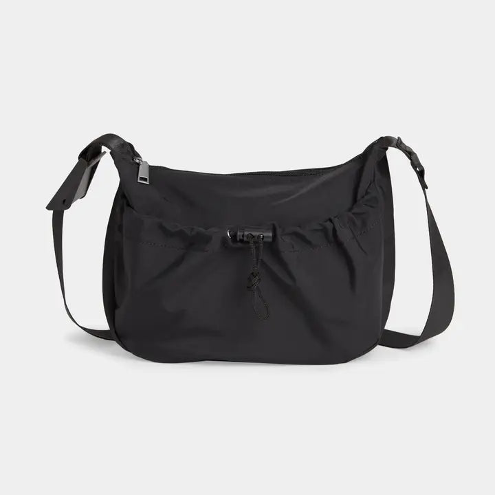 Sporty nylon carry-all with a drawstring front pocket, hidden snap closure for safety, zip top reveals a spacious interior with multiple storage compartments for tech and personal items. Wide nylon strap features durable PVC hardware. Dimensions: 13.5"W x 9.25"H x 3.5"D.