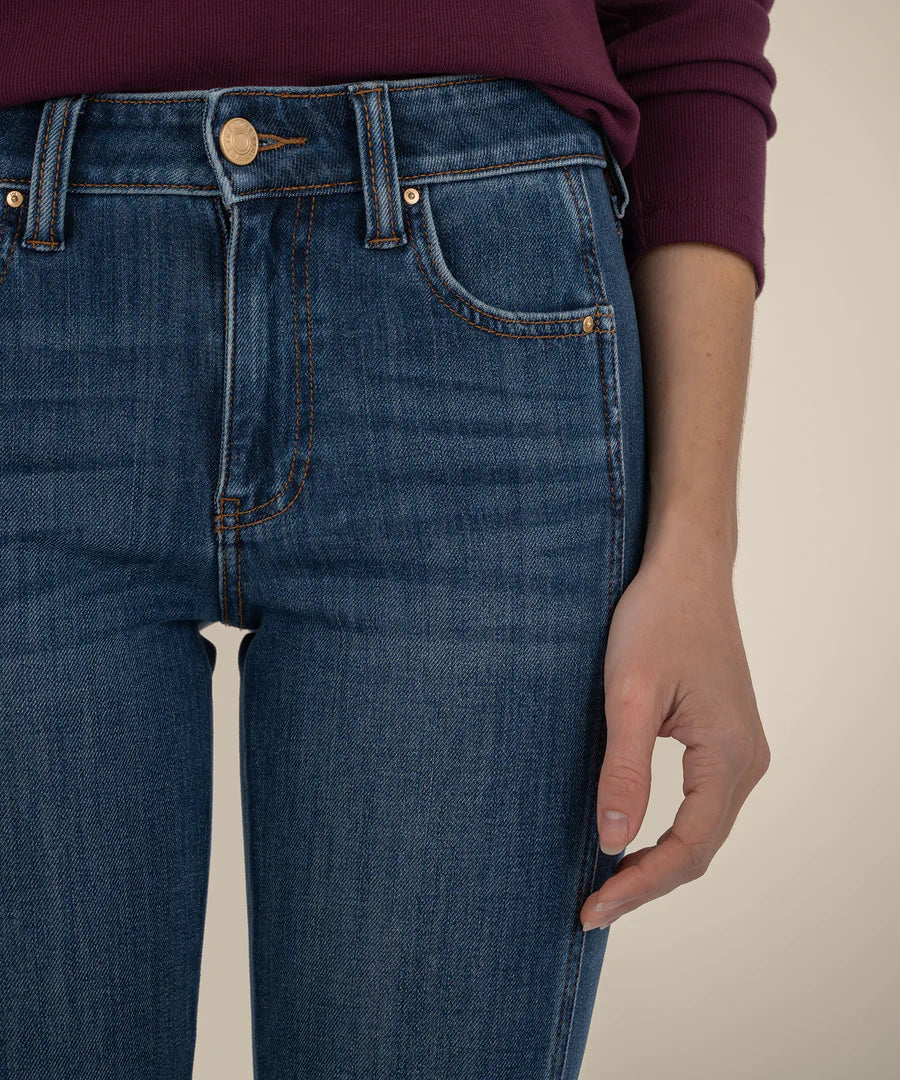 These high rise bootcut jeans are a fresh take on a classic silhouette. Designed in a versatile medium wash, they feature unique side insets and a wide hem for added style and movement. Made from super stretchy material, they offer a comfortable, flexible fit that keeps its shape all day.