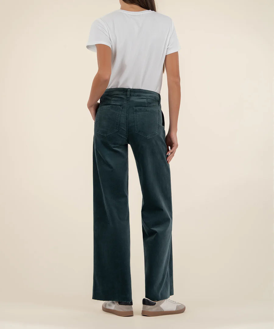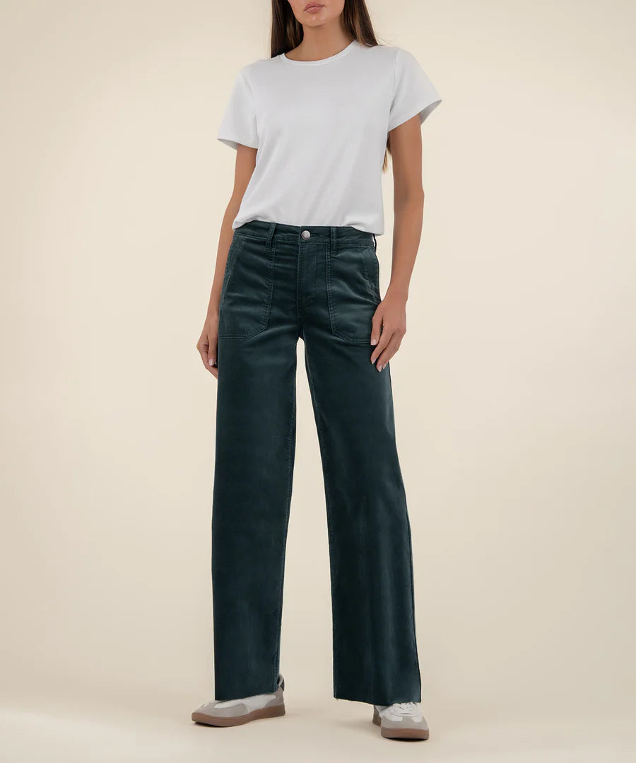 Stand out in style with these high-rise wide leg pants in a bold teal color. Designed with signature porkchop pockets, a laid-back raw hem, and made from very stretchy material, they offer the perfect mix of comfort, structure, and statement-making flair.