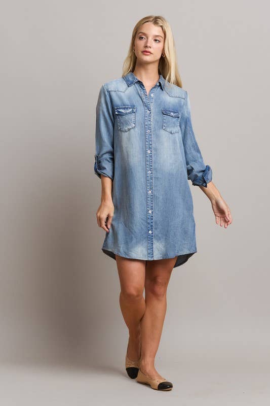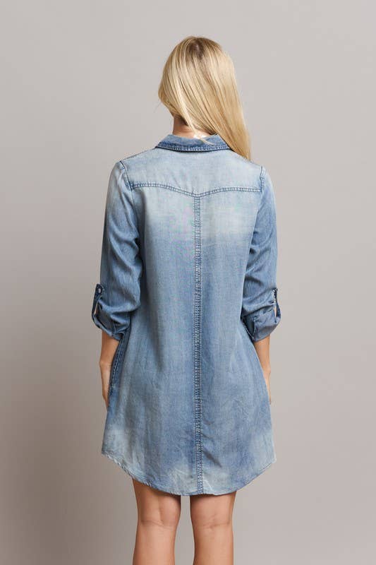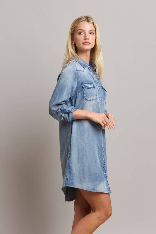 Light washed Tencel denim - Chest and side pockets - Long sleeves - Roll-up sleeve - Button down