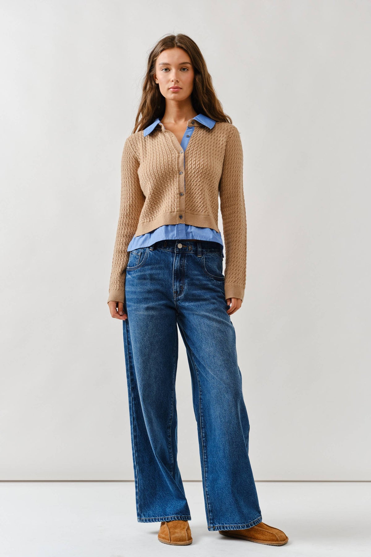 This Cable Knit Mixed Media Cardigan Features a slim fit. Knit cardigan with cotton collar and hem. Front button down closure, Perfect outfit for transition. -Spread collar; button front -Long sleeves -Slim fit