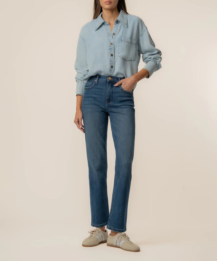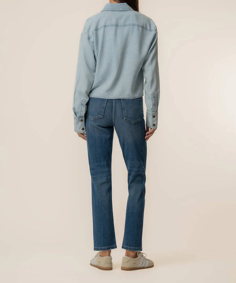 This light wash denim shirt features a classic button front, long sleeves, and a functional pocket. An easy, versatile staple great for layering or wearing on its own.
