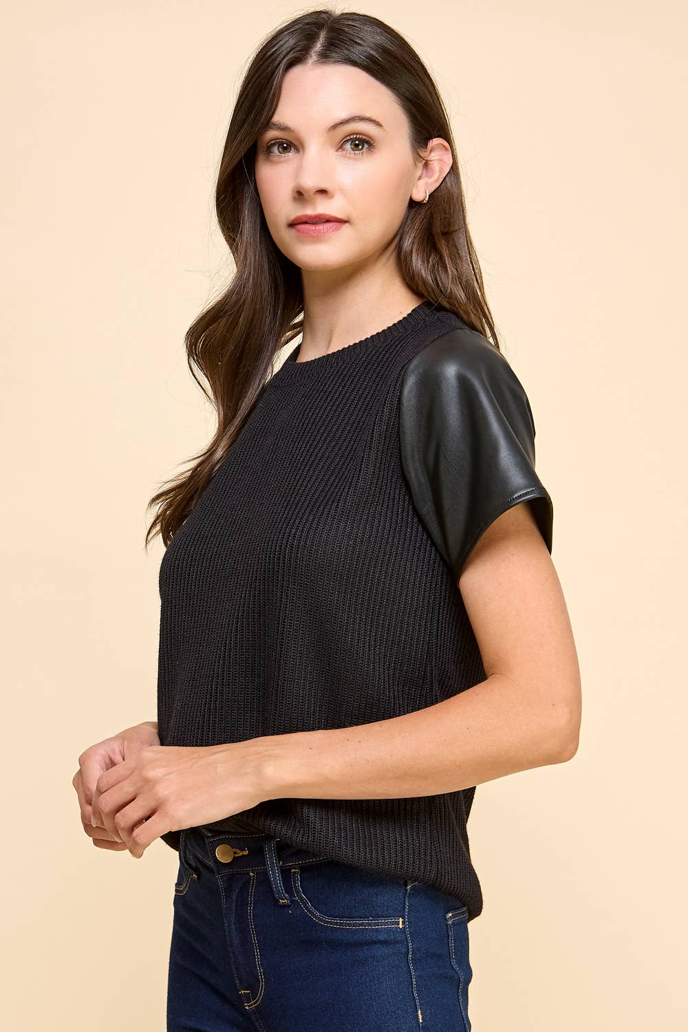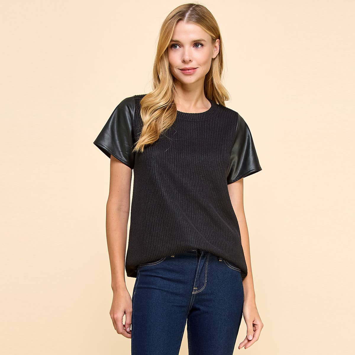This knit solid top is enhanced with chic short faux leather sleeves, creating a striking contrast between the soft fabric and edgy accents. Perfect for adding a touch of sophistication to any outfit, this versatile piece effortlessly blends comfort with contemporary style. Ideal for both casual and dressy occasions.