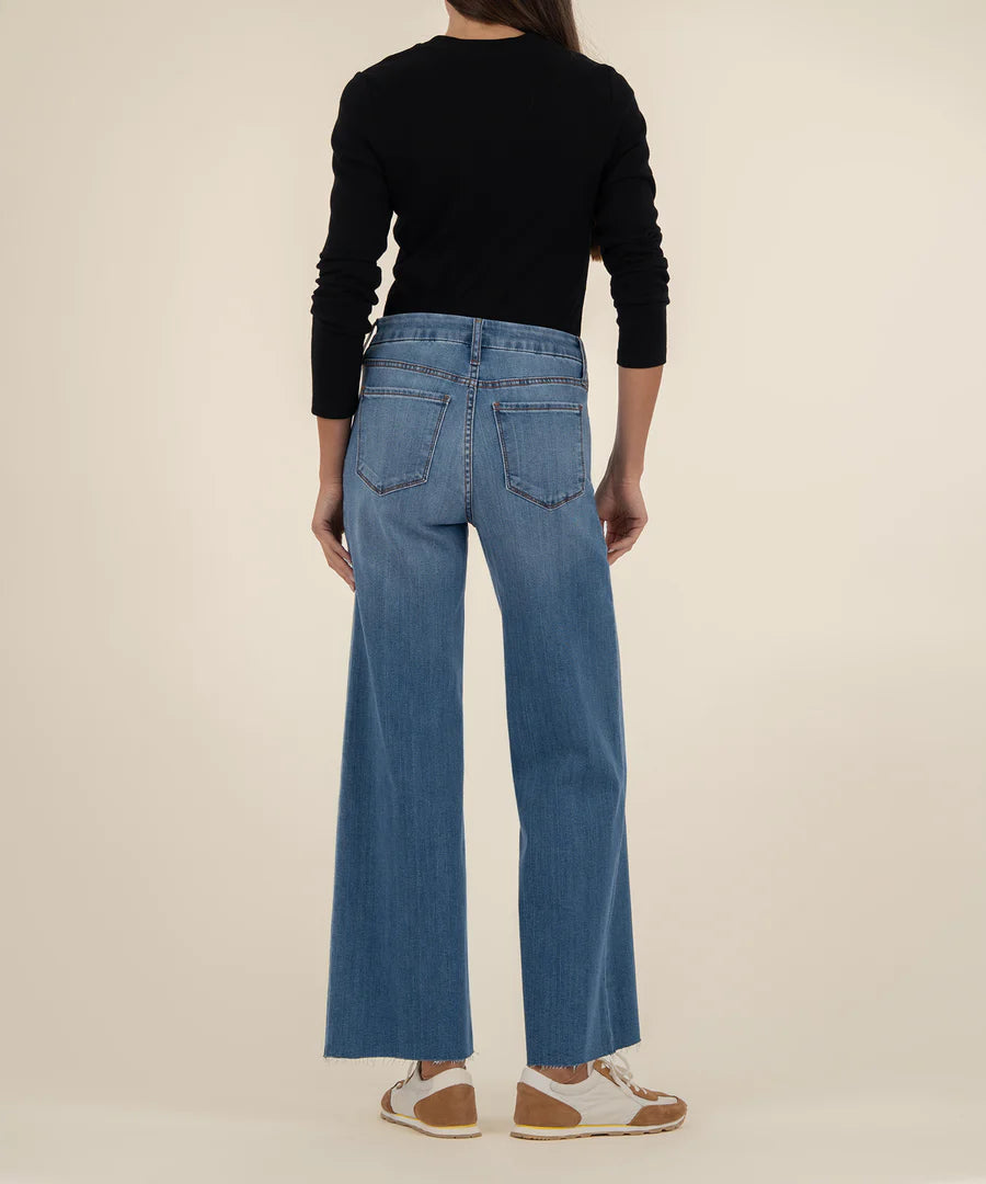Upgrade your denim with these high-rise wide leg jeans in a timeless medium wash. Featuring clean front inset pockets, a cool raw hem, and soft, stretchy fabric, they blend laid-back edge with all-day comfort—perfect for effortless, everyday style.
