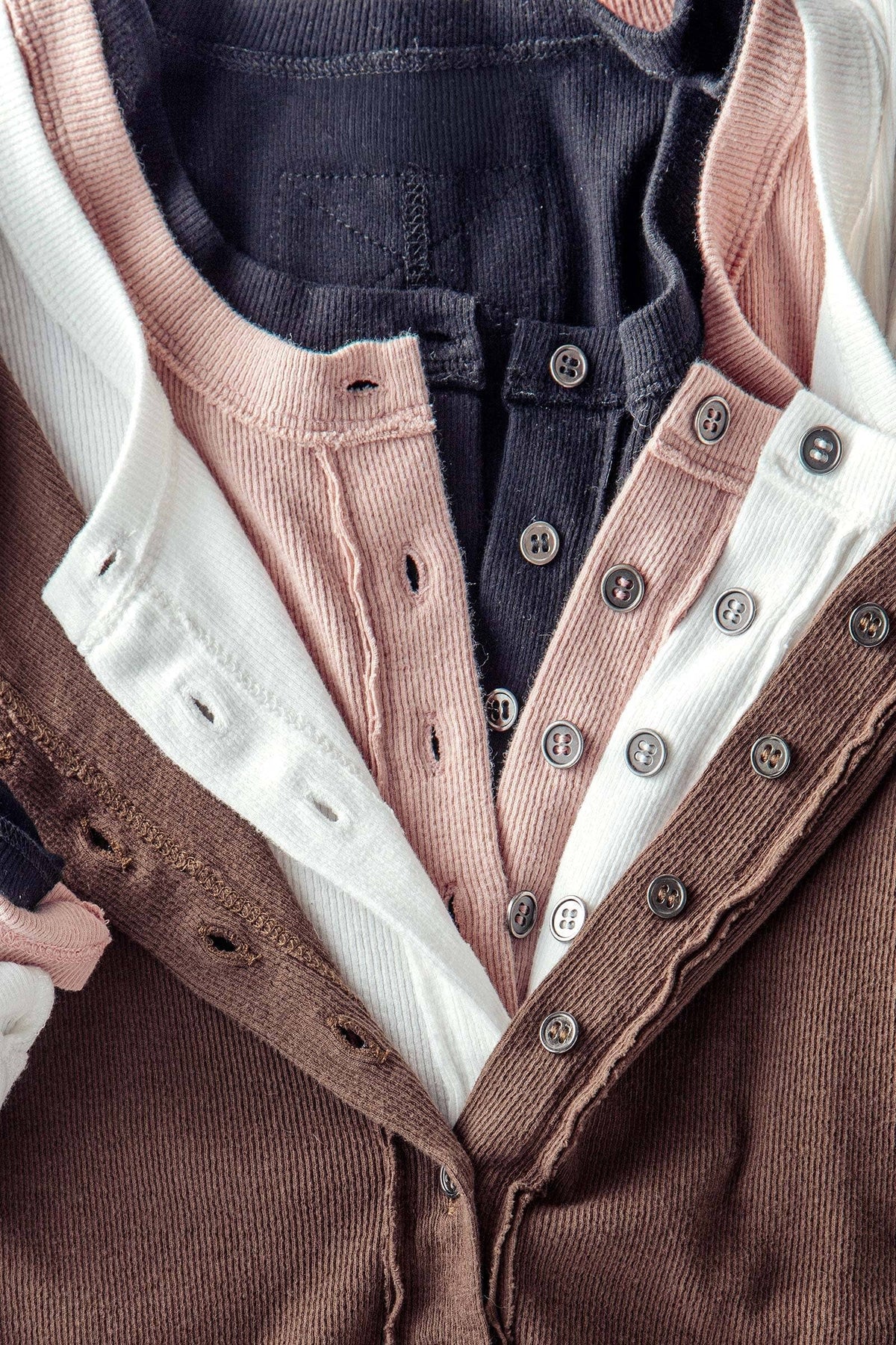 Soft, ribbed knit fabric • Classic button-up henley neckline • Stretch fit for comfort and flexibility •Slim fit with stretch for a flattering silhouette. Designed to sit comfortably at the hip.