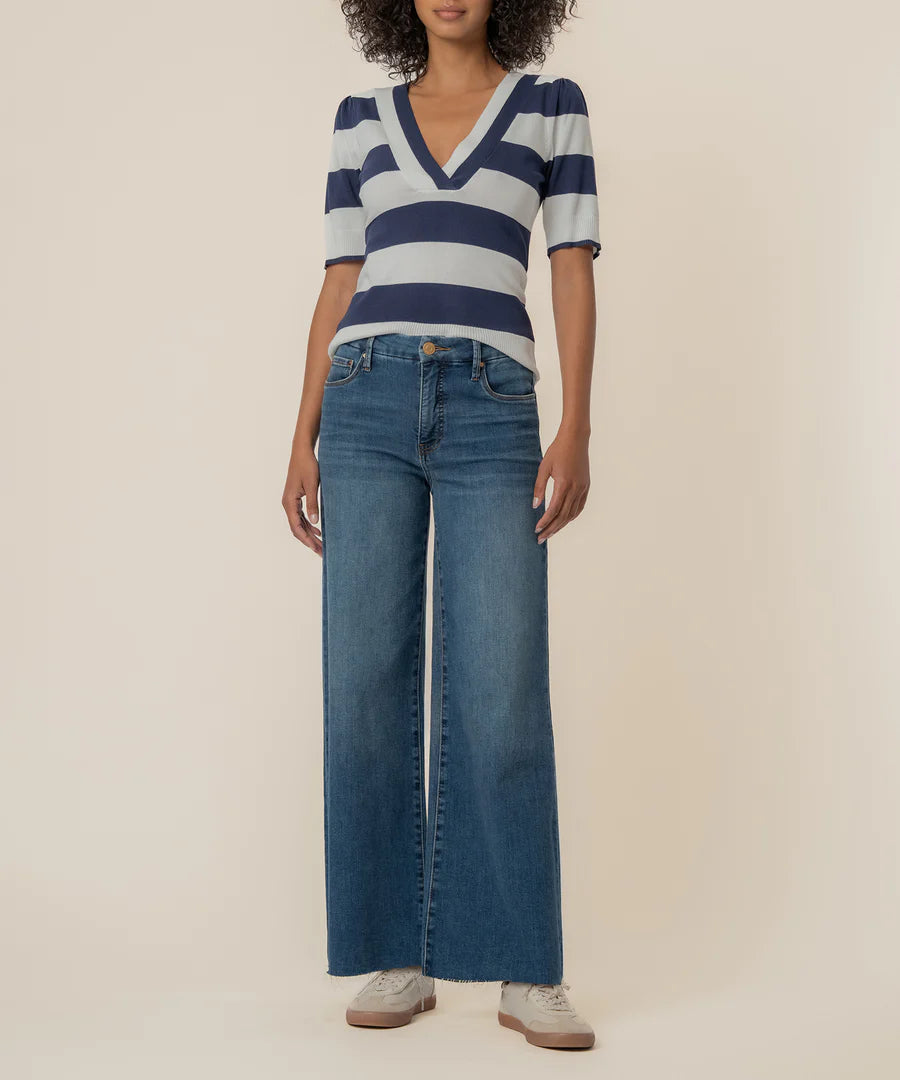 This striped sweater features short sleeves and a flattering deep V-neckline for an easy, modern look. Made from stretchy, soft material, it’s comfortable, versatile, and perfect for everyday wear.