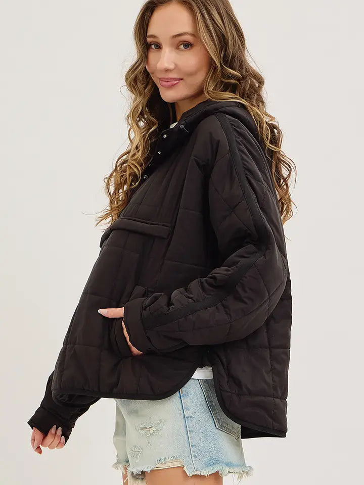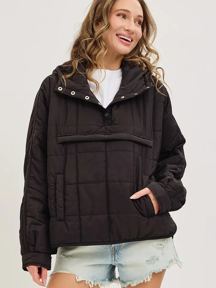 Stay warm and effortlessly stylish with this quilted pullover puffer hoodie. Designed for comfort and versatility, this outerwear piece features a relaxed fit with a hooded button-up neckline. Lightweight warmth without bulk. Soft yet structured quilting that provides both insulation and a sleek silhouette. Large front flap pocket with zipper, cuffs with snap buttons and side pockets. Curved side slits for added mobility and style. Loose, boxy silhouette for layering.