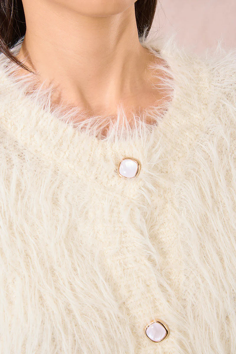 -Textured fur-effect vest-Long sleeves-Round neckline-Fancy button closure on the middle front-Straight and short cut-Length from the shoulder 20.1 inch for a size S