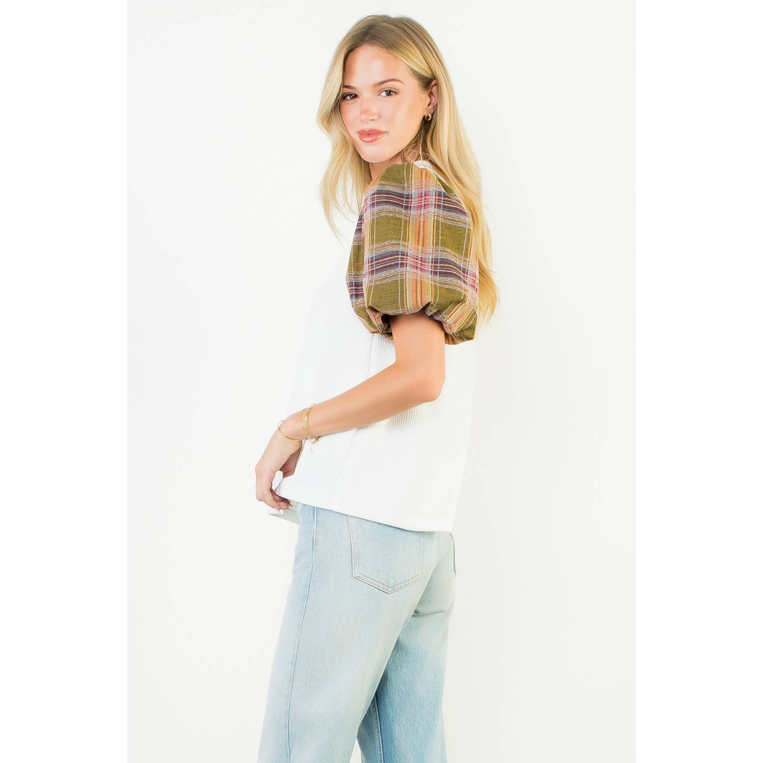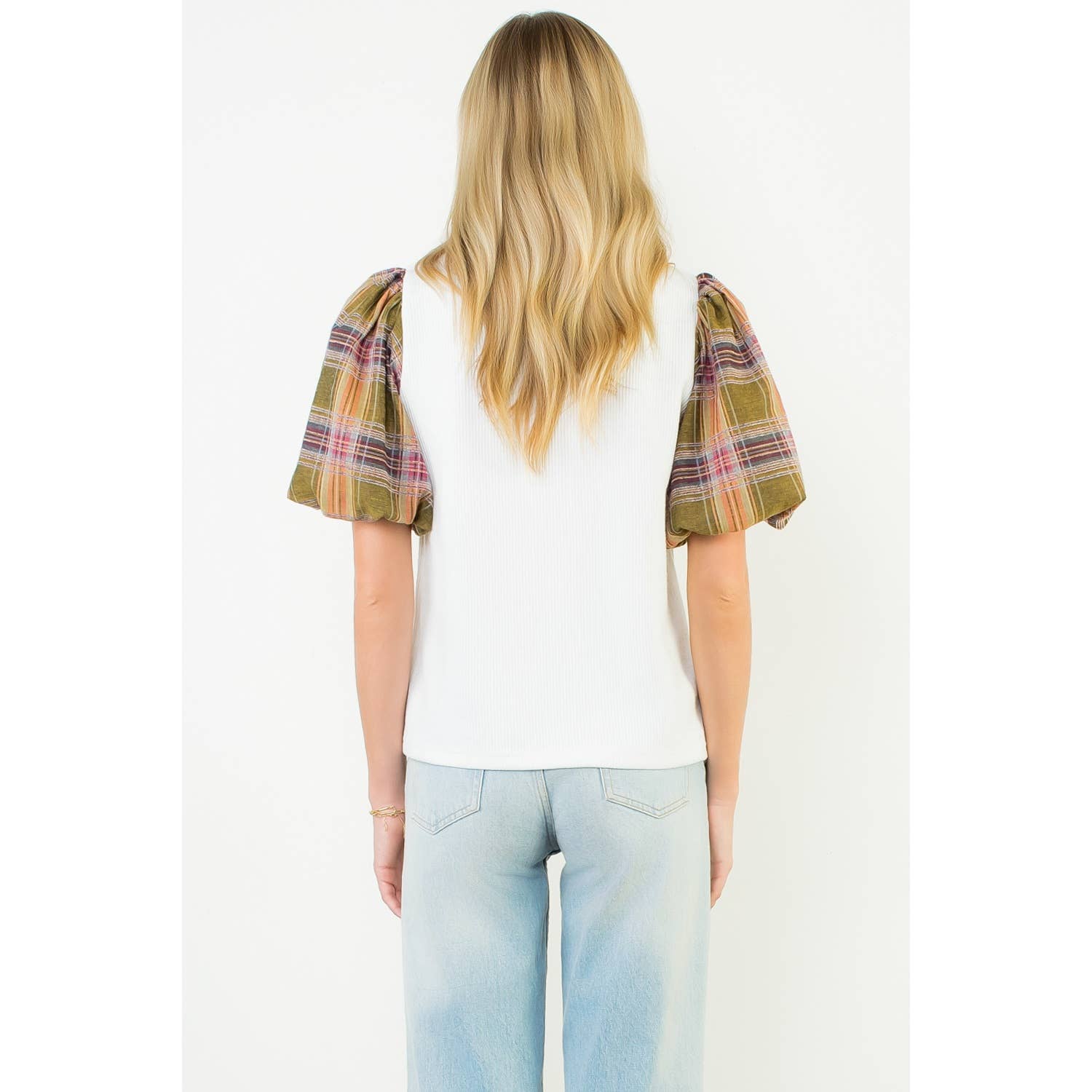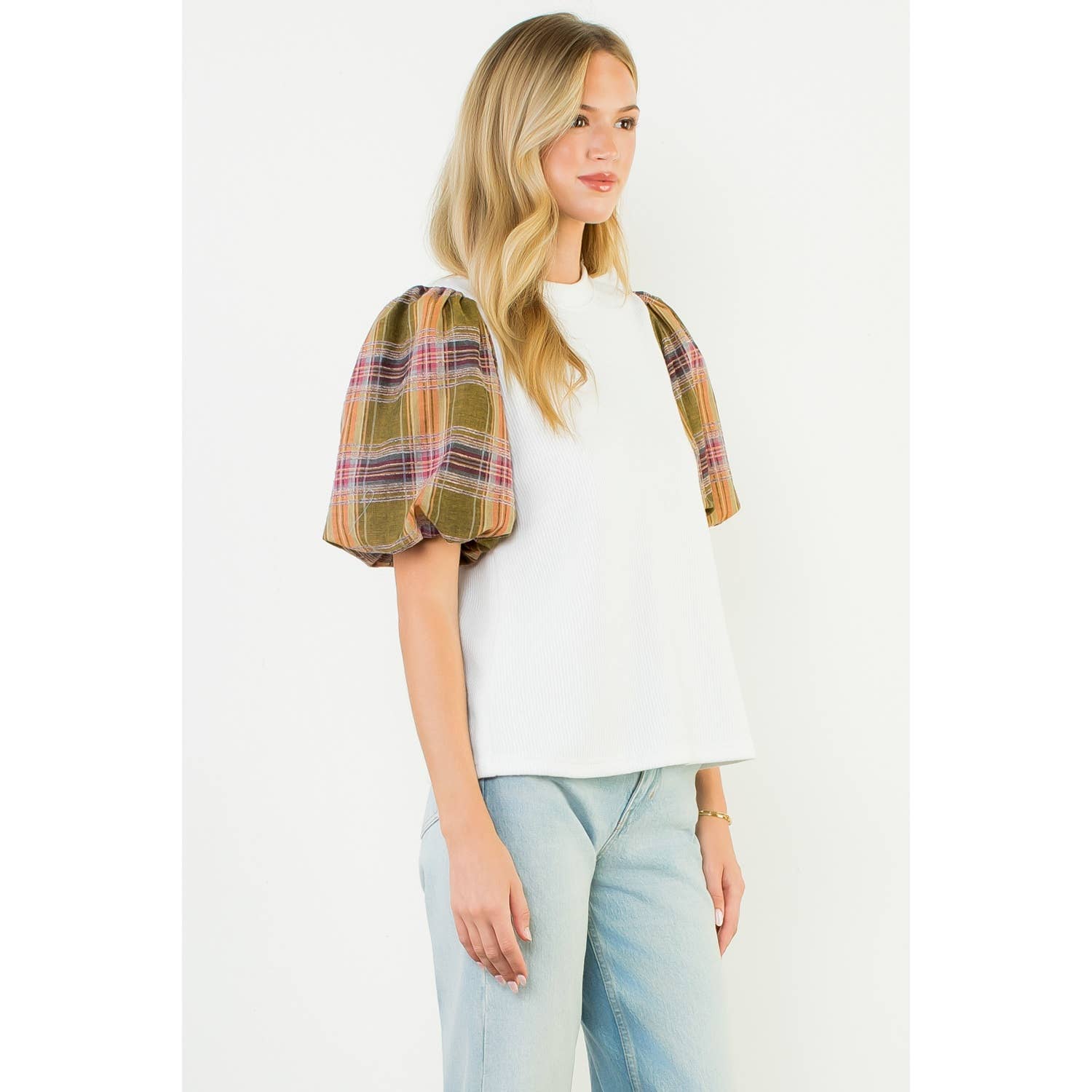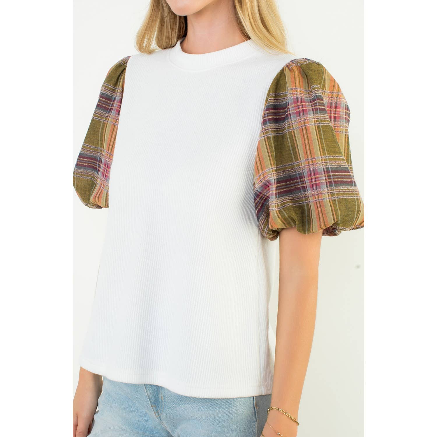 Plaid Puff Sleeve Mixed Media Top