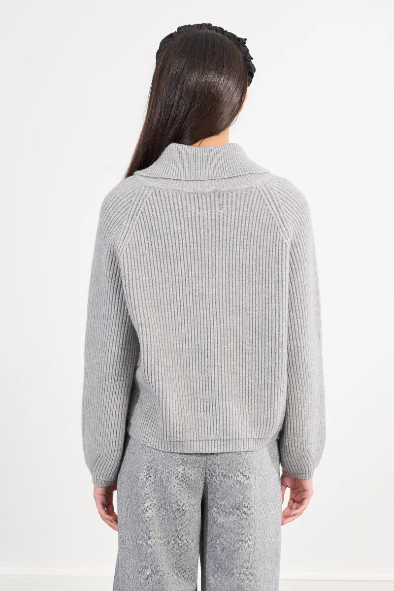 Long ribbed knit sweater-Long, slightly puffed sleeves-Wide trucker collar-Full-length front zip closure-Straight fit