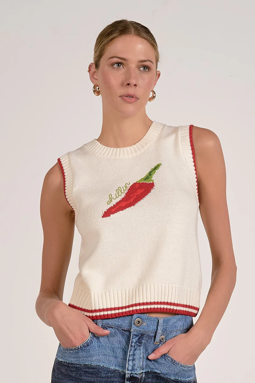 Spice things up with this playful twist on an elevated basic. The Chili sweater tank brings heat with its pepper embroidery and clean, high crew neckline. Crafted in a soft, lightweight sweater knit, this sleeveless silhouette is made to pair with denim, linen, or your favorite statement pant. Slightly cropped for an effortless tuck, it’s an instant conversation starter.