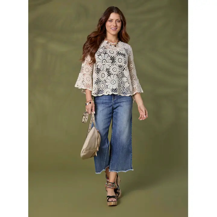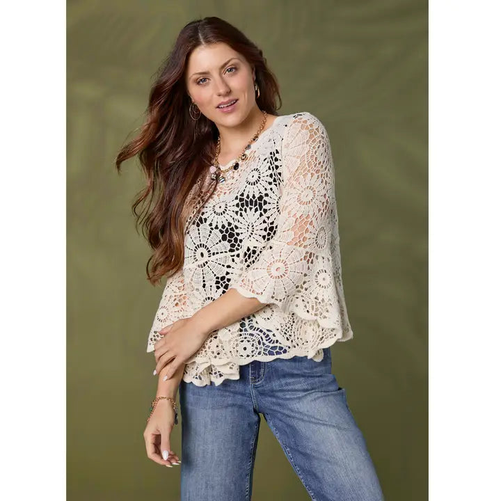 Crafted with intricate crochet detailing and a flattering elbow sleeve design, this top is perfect for layering over your favorite camisoles or bralettes. Stay stylish and comfortable all day long in this versatile piece. Materials: Cotton